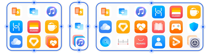 相比前代,HarmonyOS 3的智能文件夹提供了更多的尺寸选择,布局更加灵活。长按文件夹并拉动边缘即可随心调整大小,不论应用数量多少,都能找到合适的尺寸进行收纳。可大可小的文件夹,让用户既可以根据桌面空间和应用数量灵活调整桌面,又能做到应用一点即达,可谓一举两得。