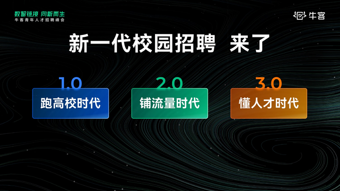 校园招聘经历过最早期比较粗放的形态,那时候的HR主要靠“跑”高校,做纯线下招聘,我们称之为1.0跑高校时代。后来,随着互联网兴起,校园招聘慢慢进入2.0铺流量时代,靠铺渠道堆量来抓住人才红利。现如今,通过学生和企业的调研和访谈,牛客发现无论是从求职端还是招聘端,校园招聘都在发生明显变化——充满个性化、去中心化、追求精准匹配,我们称之为校园招聘3.0 懂人才时代。