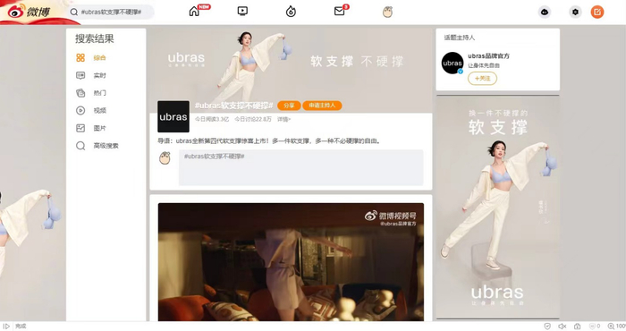 3月3日,ubras发布TVC《软支撑不硬撑》,官宣第四代软支撑新品上线。该短片一经发布,便引起广大用户的关注和讨论。#ubras软支撑不硬撑#的话题迅速登上微博热搜榜,阅读量突破3亿。