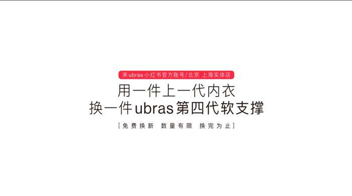 在发布新品TVC的同时,ubras还发起“换一件软支撑”福利活动。3月3日至3月8日期间,用户可以通过小红书官方账号以及指定门店参与该活动,按照品牌方相关规定,即可用一件旧内衣换一件ubras第四代软支撑。ubras希望通过该活动,让更多女性从体验到更舒适,也更有支撑力的内衣,让更多女性知道舒适和美好胸型之间可以完美结合。
