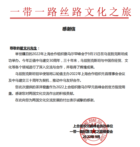 亮相上合组织撒马尔罕峰会,标志着茶洋窑国际化之路更进一步。瞿文兴主动担当文化传承的社会责任,引领茶洋窑再度出海,再续海丝之路的辉煌。