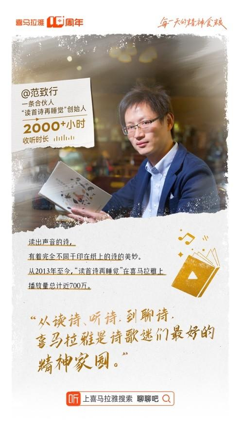 在喜马拉雅上,还有一群诗歌爱好者,如范致行和他创立的“读首诗再睡觉”。从2013年至今,“读首诗再睡觉”在喜马拉雅上的专辑播放量总计近700万。“读出声音的诗,有着完全不同于印在纸上的诗的美妙。从读诗、听诗,到聊诗,喜马拉雅是诗歌迷们最好的精神家园。”范致行说。