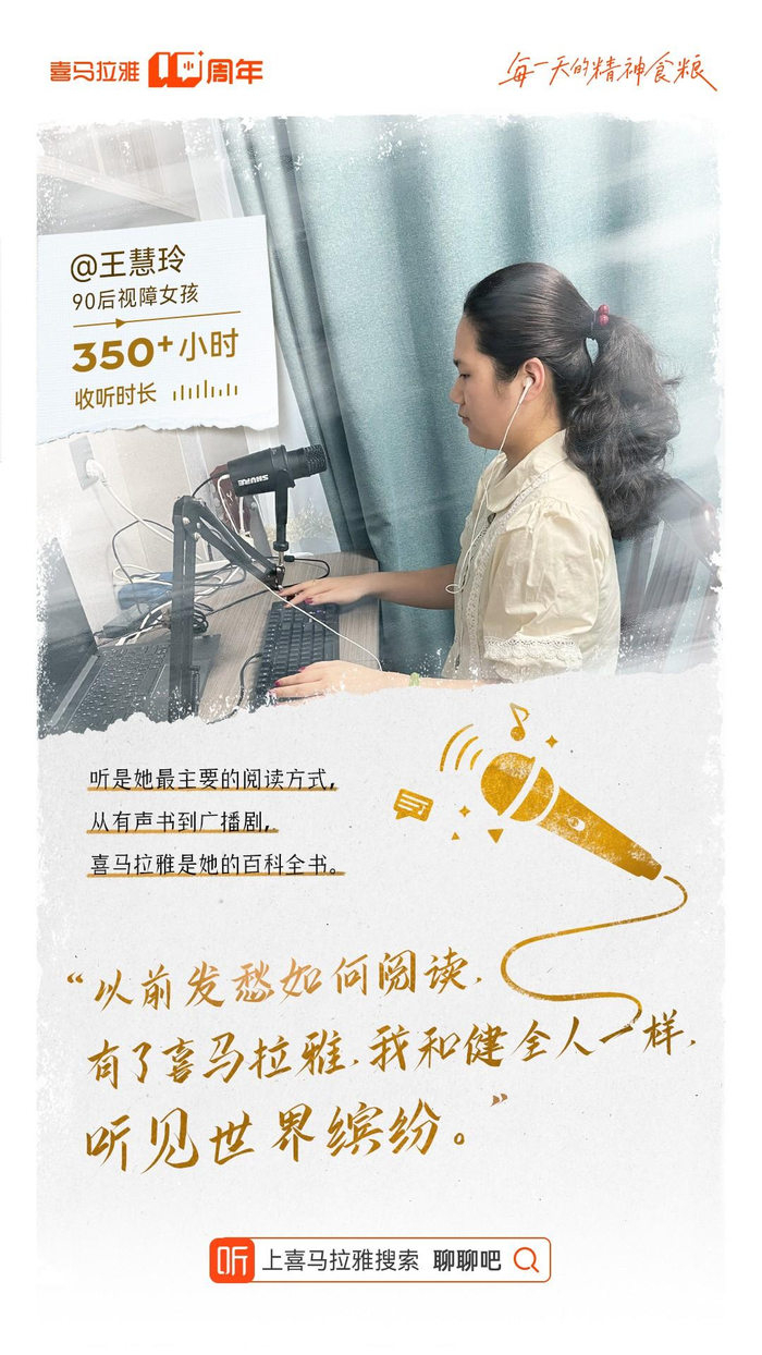 作为视障用户,王慧玲以前发愁如何阅读,“有了喜马拉雅,我和健全人一样,听见世界缤纷”,听是她最主要的阅读方式,从有声书到广播剧,喜马拉雅是她的百科全书。而作为有声书主播,王慧玲和喜马拉雅平台上10000多名残疾人主播一样,通过声音为自己开辟了人生新道路,在声音世界寻获光明。