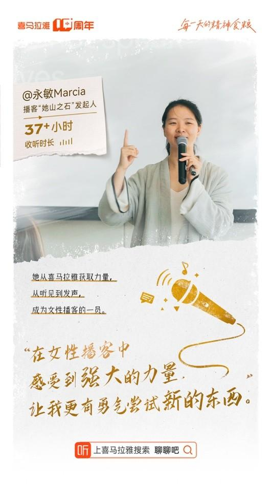 永敏工作忙碌,她经常一边听音频一边做事。“我经常边做饭边听节目,这是我的放松时间。”这些在工作之余获取到的声音能量,让她从不同视角、不同层面了解到社会中女性的经历、想法。“每次听到她们的阐述、思考都让我打开了视野,在她们身上我听到了一种力量感。”永敏说。今年6月,永敏所在的女性联盟也在喜马拉雅开设了播客节目《她山之石》,通过对话有智慧、有力量的女性伙伴,分享榜样的故事、呈现多元的声音、传递联结的能量,启发女性成长。