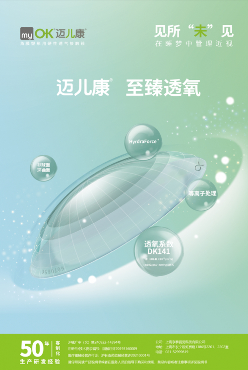 依托于中国台湾亨泰集团50多年的研发与制造经验,同时作为亚太地区最早引入角膜塑形镜技术品牌,myOK迈儿康通过自身25年角膜塑形镜的临床数据沉淀,研发出更安全、更适合中国青少年儿童的角膜塑形技术。