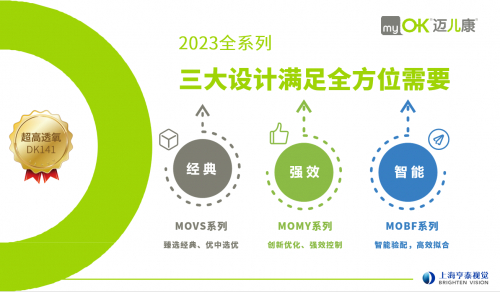 为满足不同情况近视青少年儿童的视觉管理需求,myOK迈儿康自上市至今共三款产品: myOK- MOVS经典:高透氧好健康;myOK-MOMY新形态—高离焦好控制;myOK-MOBF AI智能—智能定制好精准。