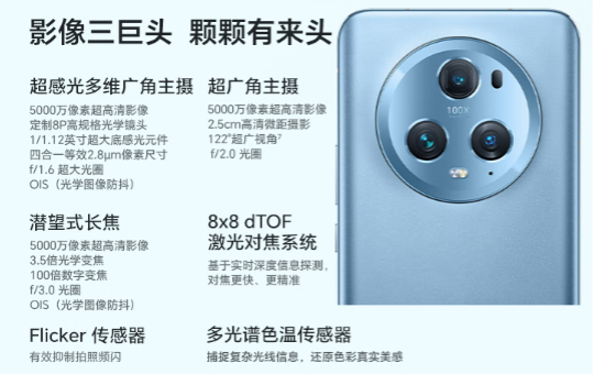 荣耀Magic5 Pro屏幕支持第二代屏幕聚光技术,显示更清晰,搭载独立显示芯片,画质更好。荣耀Magic5 Pro还支持智慧隐私通话2.0,减少漏音还能听得清晰。荣耀Magic5 Pro影像上采用5000万像素三主摄影像系统,由5000万像素广角主摄、5000万像素潜望式长焦主摄和5000万像素超广角主摄组成,进光量大,画质够好,远景近景都能完美捕捉。荣耀Magic5 Pro还搭载前置3D深感摄像头和1200万像素前置摄像头,支持3D人脸解锁,达到支付级安全保障。