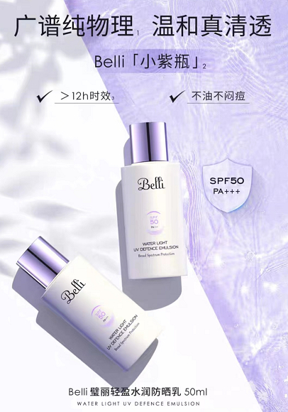经过认证,Belli璧丽新款轻盈水润防晒乳能达到SPF50、PA+++的防晒指数,且产品通过油包水体系加聚合物的双重加固,防水防汗能力增加,更能为消费者带来长久、稳定的防护效果。
