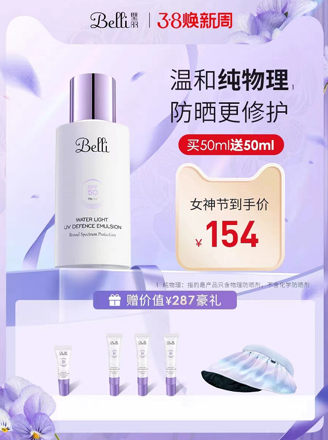 全新升级上线的Belli璧丽新款轻盈水润防晒乳,采用单纯的物理防晒成分,是目前专业防晒产品中鲜少不含化学防晒剂且质地轻薄水润的硬核纯物理防晒,对紫外线中的UVA和UVB都具有效的阻隔效果,带来长久的防晒保护。