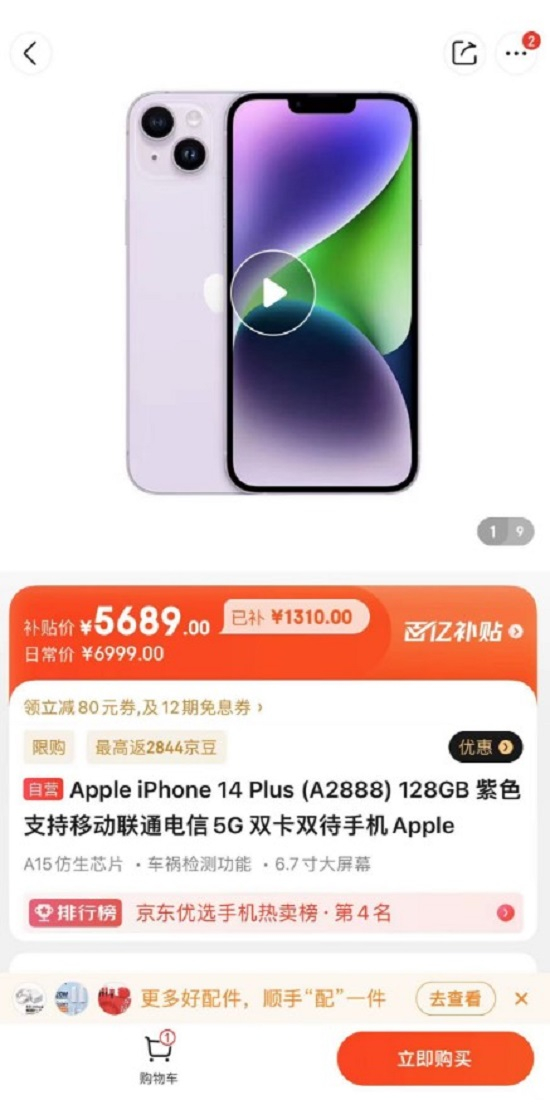 京东百亿补贴买iPhone真便宜 iPhone 14补贴超1000元