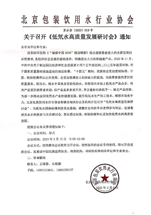 由北京包装饮用水行业协会联合中国民族医药协会及相关科研机构共同发起的“低氘水高质量发展研讨会暨中国低氘水团体标准启动会”将于2023年3月12日正式开启第一轮讨论。