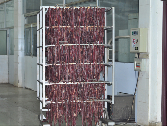 足足腌制1小时后,牛肉会挂到风干车上,以20-25℃自然风干1小时去除膻味,再转移到70℃的恒温室进行风干,更高的温度会加速熟成的速度。经过3小时后,米龙肉条从里到外经过熟成,肉质与风味完成了一次蜕变。