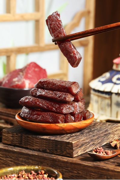 经过风干熟成的牛肉,肉汁会更加丰盈,肉质变的更加紧实,“风干风味”更浓。但很多商家在生产牛肉干时会直接将牛肉煮熟,但高温让肌肉酵素失去活性,从而无法发生熟成,也就缺少了这种特有的风味。