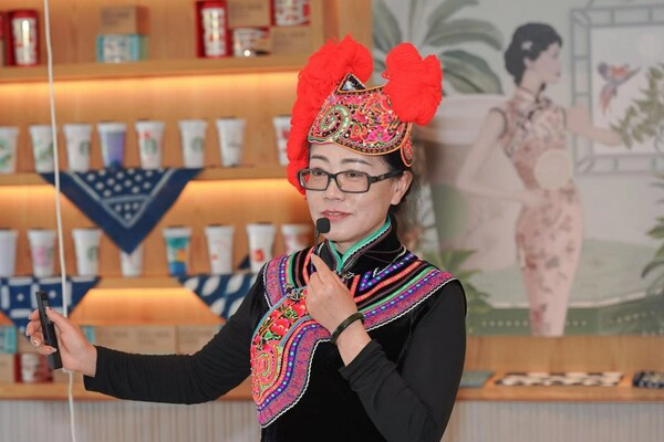 女神节前夕,星巴克上海非遗概念店 -- 星巴克臻选上海慎余里非遗概念店热闹非凡。两位"乡村妈妈" -- 白族扎染传承人张翰敏和彝绣传承人段宛君身着精美民族服饰,走进星巴克"星绣未来"非遗沙龙,与上海市民分享她们引以为豪的非遗作品,以及励志向上的追梦历程。