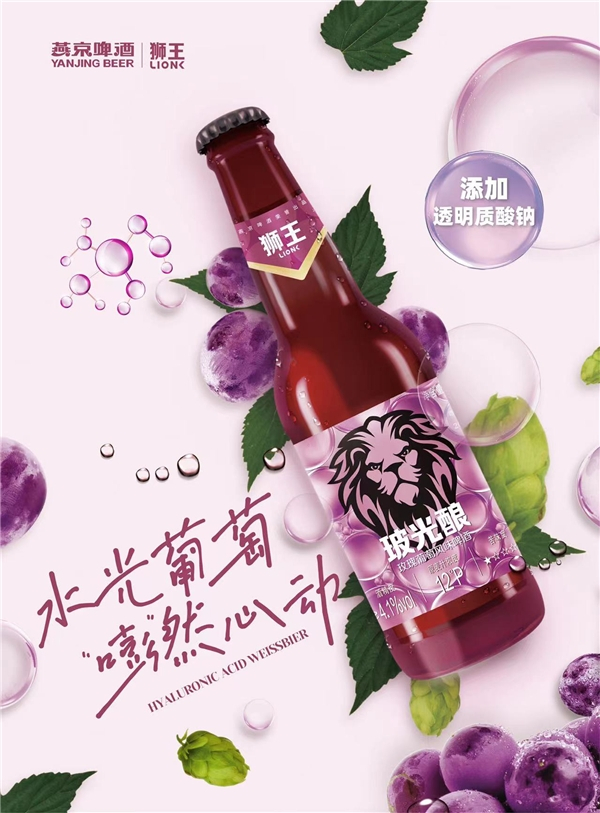 全新上市的燕京狮王玻光酿玫瑰葡萄精酿啤酒款产品打造了“玻尿酸、女性啤酒”新鲜概念,精选原料,独创工艺配方,添加红葡萄汁与透明质酸钠,打破传统壁垒,将玻尿酸与葡萄等经典果味复合混搭。