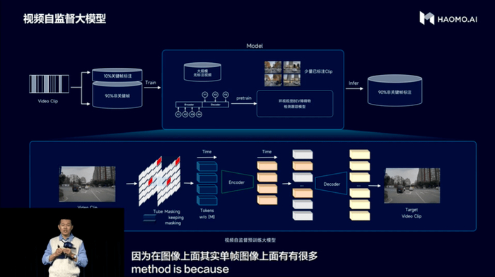 首先是视觉自监督大模型,让毫末在中国首个实现4D Clip的自动标注。毫末利用海量videoclip,通过视频自监督方式,预训练出一个大模型,用少量人工标注好的clip数据进行Finetune(微调),训练检测跟踪模型,使得模型具备自动标注的能力;然后,将已经标注好的千万级单帧数据所对应的原始视频提取出来组织成clip,其中10%是标注帧,90%是未标注帧,再将这些clip输入到模型,完成对90%未标注帧的自动标注,进而实现所有单帧标注向clip标注的100%的自动转化,同时降低98%的clip标注成本。毫末视频自监督大模型的泛化性效果极佳,即使是在一些非常困难的场景,例如严重遮挡的骑行者,远处的小目标,恶劣的天气和光照,都能准确地完成自动标注。