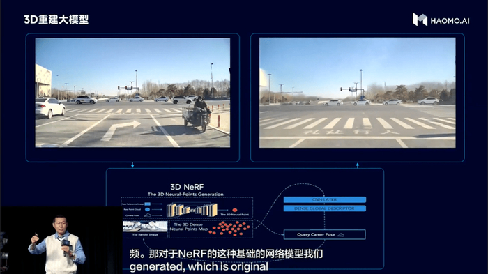 其次是3D重建大模型,助力毫末做数据生成,用更低成本解决数据分布问题,提升感知效果。面对“完全从真实数据中积累corner case困难且昂贵”的行业难题,毫末将NeRF技术应用在自动驾驶场景重建和数据生成中,它通过改变视角、光照、纹理材质的方法,生成高真实感数据,实现以低成本获取normal case,生成各种高成本corner case。3D重建大模型生成的数据,不仅比传统的人工显式建模再渲染纹理的方法效果更好、成本更低。增加NeRF生成的数据后,还可将感知的错误率降低30%以上,且数据生成可实现全程自动化,无需任何人工参与。
