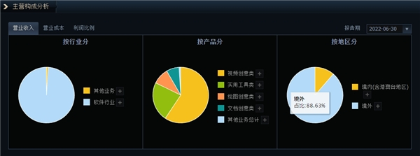 公开信息显示,创意软件A股龙头万兴科技(300624.SZ)是中国数字创意软件领域产品覆盖面广、营收体量大、全球化程度高的A股上市公司,业务覆盖200多个国家和地区,全球累计用户数超15亿,被誉为“中国版Adobe”。数据显示,万兴科技海外营收占比88.63%,毛利率超97%。