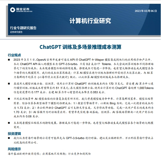 3月6日,国金证券发布研报《ChatGPT训练及多场景推理成本测算》,对不同应用场景中 ChatGPT 的推理成本进行了估算。