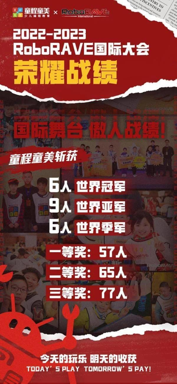 在本场挑战中,来自童程童美的战队收获傲人战绩:有6名选手获得世界冠军,9名选手获得世界亚军,6名选手获得世界季军!并有57名选手拿下一等奖,65名选手拿下二等奖,77人拿下三等奖。