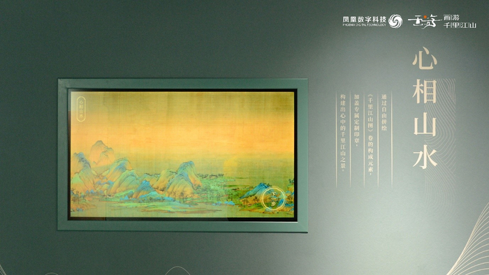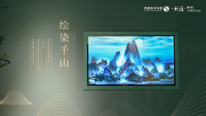 观众可以根据自己心中所想在触摸屏上挥毫千里、手绘江山,触碰被晕染得青翠欲滴的山水之色,如若画中翱游。感受随着触碰而晕染的青绿山水,体验绘染千山的奇妙意境。