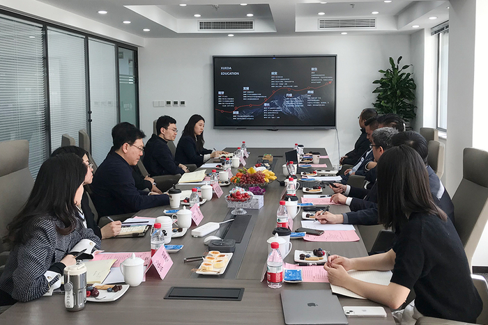 在交流会伊始,金鑫首先代表集团对调研组一行的到来表示热烈的欢迎。随后,围绕学大的教育理念、业务布局、人才培养、职业教育、产教融合、社会责任等方面详细介绍了学大集团的发展现状及近年来取得的标志性成果。