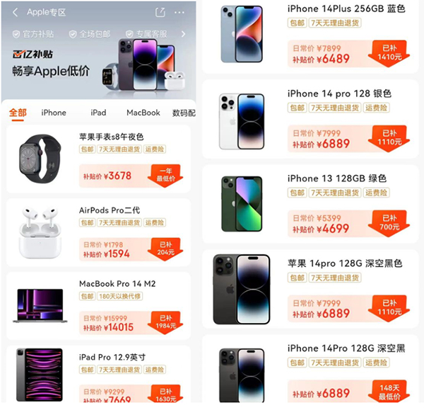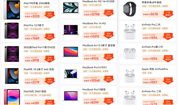 iPad、MacBook及配件也同样在京东百亿补贴提供超值优惠价。iPad 9 256GB WLAN版京东百亿补贴价3220元,iPad Pro 11英寸2022款128GB WLAN版京东百亿补贴价5918元,入手非常合适。更有MacBook Air 13.6英寸M2 16+512GB京东百亿补贴价10798元,MacBook Pro 14英寸M2 Pro芯片16G 512G京东百亿补贴价14015元,AirPods Pro第二代京东百亿补贴价格1594元,有需要的朋友把握这波好价,赶快下单吧。