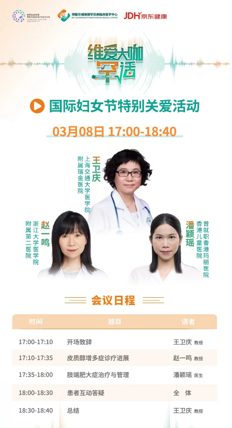 值此国际三八劳动妇女节之际,博鳌乐城维健罕见病临床医学中心特发起 “国际妇女节特别关爱活动”,聚焦库欣综合征和肢端肥大症的疾病科普,介绍临床诊疗知识,提升患者健康管理。 本次活动将通过博鳌乐城罕见病临床医学中心、博鳌乐城国际医疗旅游先行区、京东健康等平台同步直播,欢迎关注。