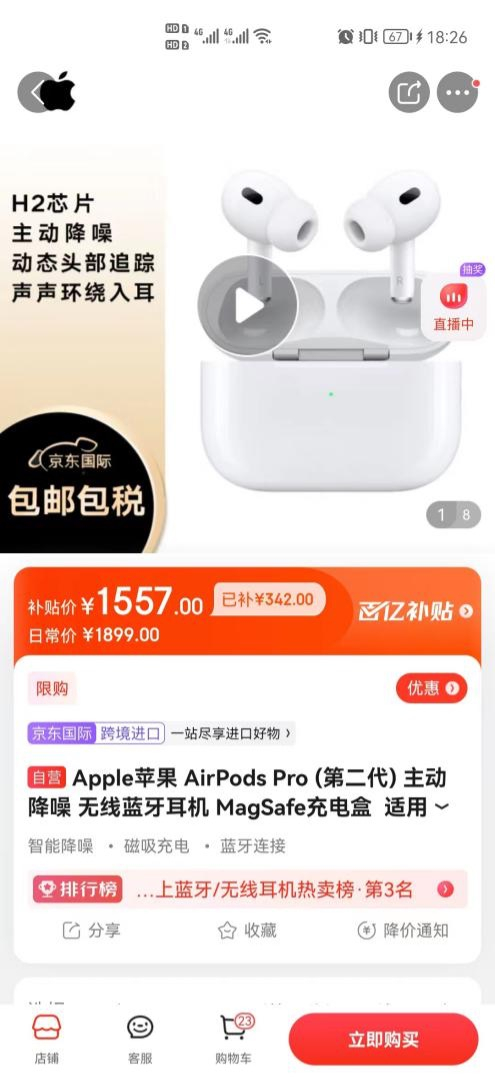 除了电脑及平板产品外,京东百亿补贴还上线AirPods,价格同样超值。AirPods在降噪、听觉体验上都有不错的表现,消费者可以趁现在选择京东百亿补贴购入。其中,AirPods Pro(第二代)配MagSafe充电盒,京东百亿补贴价1557元。