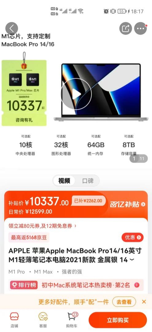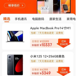 对于办公人群来说,MacBook是必备的生产力工具,京东百亿补贴拿下可以享受超值优惠。其中,MacBook Pro 14英寸M1芯片16G 512G版京东百亿补贴价10337元,补贴了2262元,心动的消费者赶快来京东百亿补贴专区购买。