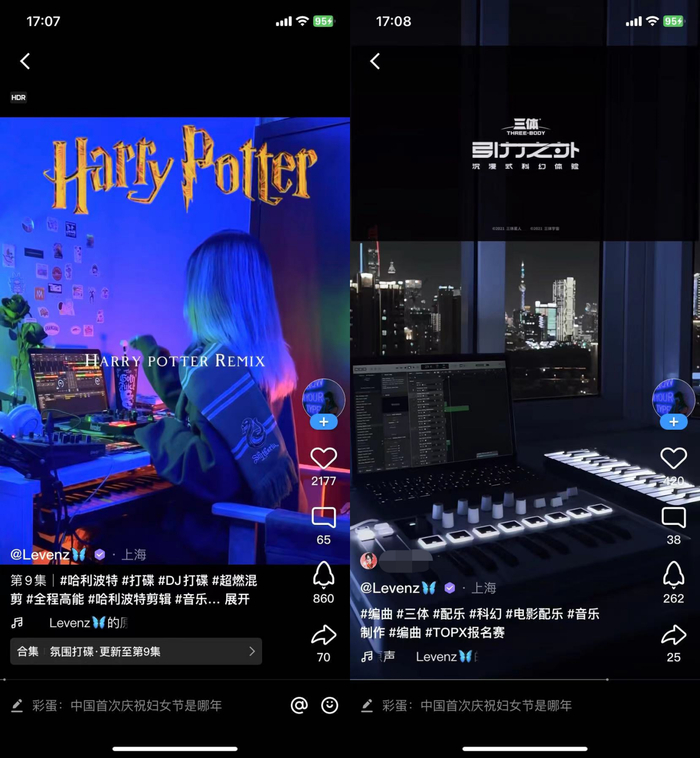 除了《乌梅子酱》的二创,还有对经典影视作品的二创甚至是原创,来自复旦的医学学霸@Levenz将哈利波特高能片段改编成了一首电子音乐,让粉丝沉浸式体验魔法世界;看完《三体》后还原创了一首配乐,再现气势恢宏的科幻大片感。