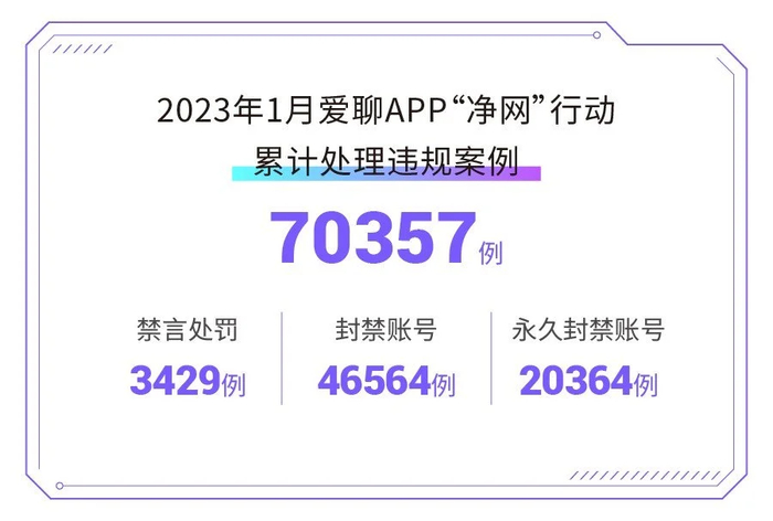 作为新一代婚恋平台,爱聊APP自上线以来始终高度重视网络安全,2022年是爱聊APP贯彻落实“净网”行动的第三年,据了解,爱聊APP在2022年的“净网”行动累计处理违规案例962747例,违规案例处罚包含:禁言处罚、禁用处罚、永久禁用处罚。随着新年的到来,在2023年1月,爱聊APP“净网”行动累计处理违规案例70357例,禁言处罚3429例,封禁账号46564例,永久封禁账号20364例。根据具体的数字情况来看,随着审核制度不断完善及网络生态持续净化,爱聊APP封禁的违法违规用户数量稍有起伏,但总体呈下降趋势。