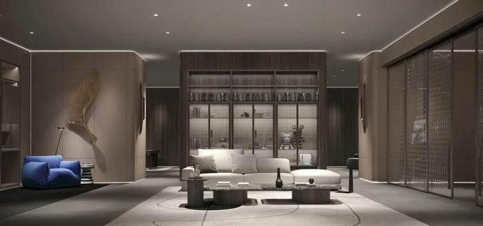 迎宾区域,宽大弧形沙发配合通透隔断柜,是主人礼让、豁达态度的第一呈现视角,也暗示虚实思辩、方圆合一的处世之道。