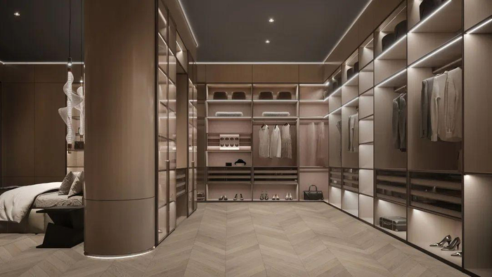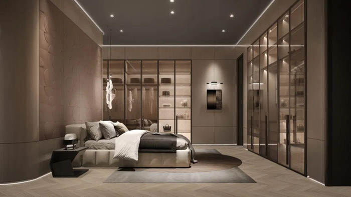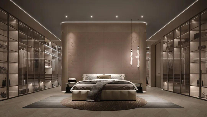 传统单面柜体基础上,背板和侧板处经过精心设计,成为艺术景观。重复手法的圆形纹理,皮革压纹工艺,是装饰元素,也是品牌符号的展现。卧室、衣帽间增加水吧台,停留时饮用和清理更从容。