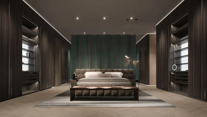 深色木纹搭配绿色皮革,沉稳、温暖、舒适之余,贴合森系风格,素雅、简洁、自然、超凡。细节处,奢华质感融入每一次碰触。