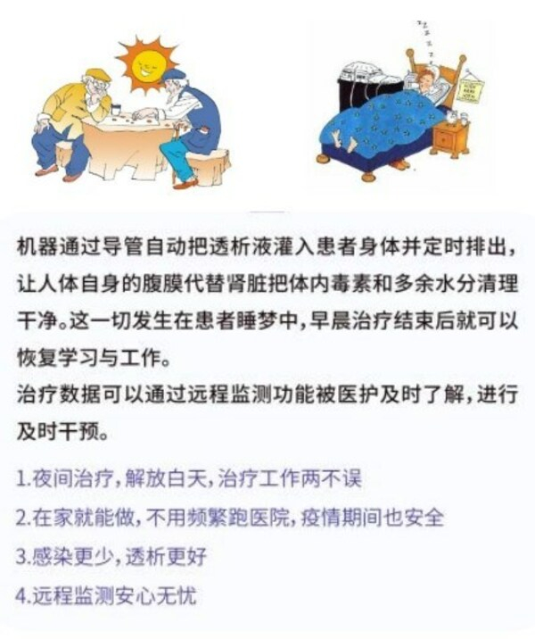 患者进行 APD 治疗的过程中,机器会自动监测并记录每个周期的灌注量、留腹时间、引流时间、引流出量等治疗数据,整个过程均由机器自动操作,所以一般将 APD 治疗时间放在晚上,患者可以一边睡觉一边进行治疗,可以在很大程度解放患者的日间时间,对于有工作、学习以及社交生活需求的患者来说,能够促进患者更好的回归社会;APD 治疗方式的透析剂量更灵活、小分子溶质清除能力更强,显著提高了腹膜透析的治疗效果;部分新型 APD 带有远程患者管理功能(RPM),自动上传治疗数据至医护端,使得患者能够获得更加及时可靠的医疗服务及更大的获益。