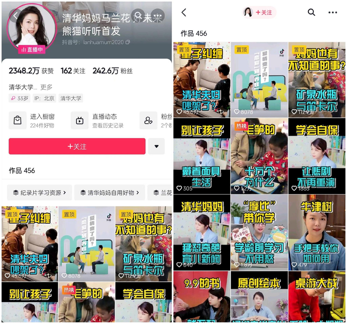 在成为抖音电商的图书知识达人之前,毕业于清华大学的马兰花供职于一家股权投资公司,拿着高薪、过着令人羡慕的生活,还是两个孩子的妈妈。2020年疫情期间,因为居家办公,她开始使用抖音记录两个孩子的日常。儿子毛笋不愿去幼儿园的视频在抖音走红,而她记录毛笋阅读英语的视频,也意外受到很多网友关注。