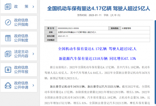 2023年1月11日,公安部发布了关于2022年全国机动车和驾驶人数据。该数据表示,2022年全国机动车保有量达4.17亿辆,其中汽车3.19亿辆,与2022年公安部统计的数据对比而言,机动车保有量就增加了0.22亿辆,其中汽车增加了0.17亿辆。机动车驾驶人也从2021年的4.81亿人涨至5.02亿人,其中汽车驾驶人也从4.44亿人涨至4.64亿人。
