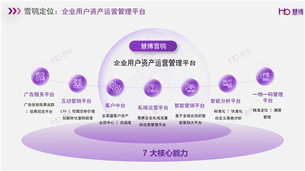 具体来看,“慧博雪鸮全渠道七大能力模块”覆盖零售企业在用户运营业务中的各个环节,涵盖广告服务平台、互动营销平台、客户中台、私域运营管理平台、智能营销平台、智能分析平台、一物一码管理平台七大能力。在模块化能力的组合加持下,慧博雪鸮能够为合作伙伴创造更多业务转化价值,共同为消费者提供更好的升级体验,在打造品牌忠诚用户资产的同时,实现业务助力和高质量增长。