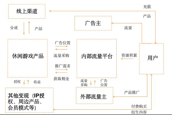 休闲游戏"短平快"的玩法设计,使得广告收入成为其主要盈利模式。这类游戏通常选择在流量平台进行分发,前期获客阶段可以实现用户的快速增长,当用户达到一定规模后,可以应用平台提供的广告主资源,完成游戏的广告变现。