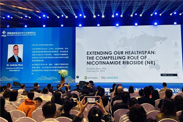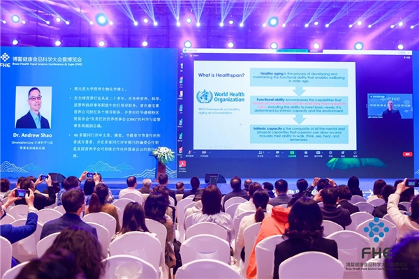 受中国工程院院士、博鳌健康食品科学大会暨博览会(FHE)发起人及大会主席陈君石先生邀请,来自美国ChromaDex的Andrew Shao博士,以现场视频连线的方式,向与会观众介绍了《烟酰胺核糖在延长人体健康期中不容忽视的作用》。