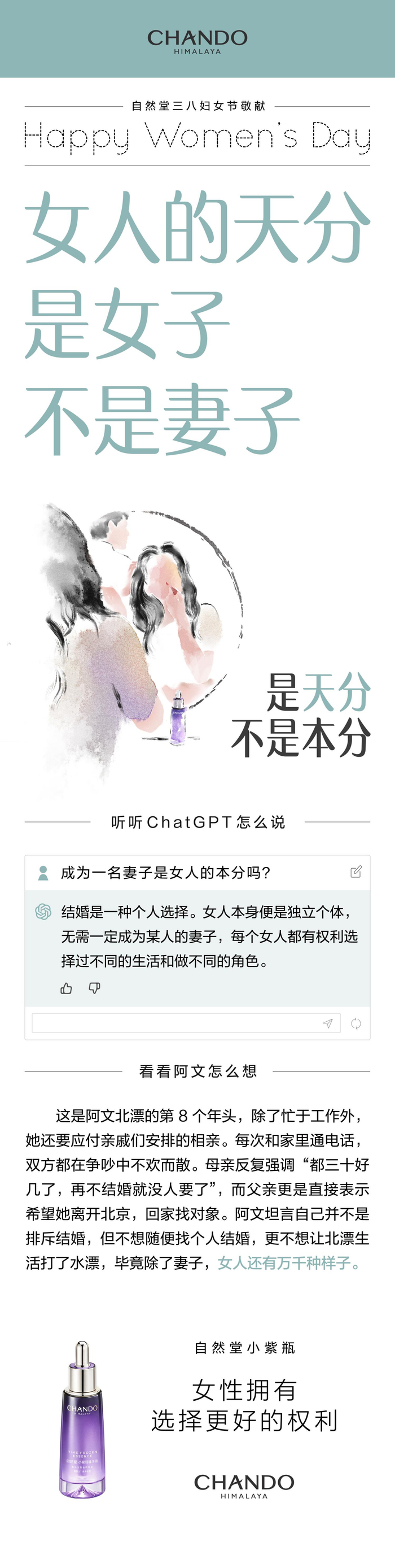 自然堂洞察于心,尊重女性的本我价值,在今年三八国际劳动妇女节来临之际,发布「是天分不是本分」系列态度海报,围绕妇女婚姻、生育、家庭权益探讨,再次延续对多元之美与女性力量的探索,意在表达每个女性都拥有选择更好的权利,鼓励中国女性勇敢表达真实本色,追求向新而生的自然生命之美。