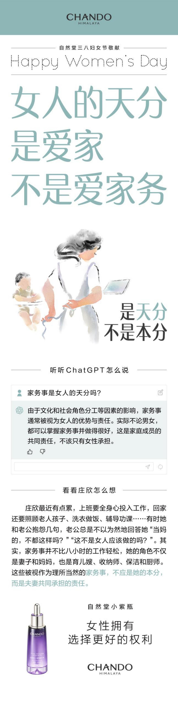 自然堂始终秉承包容尊重的多元审美,为女性群体发声。2023年三八国际妇女节,自然堂以「是天分不是本分」系列态度海报致敬她力量,意在表明:“天赋是女性与生俱来的闪光点,不应该会成为她们的枷锁和陷阱。”通过围绕女人的天赋与义务,关注女性社会议题、性别偏见话题,引发社会深思与共鸣。