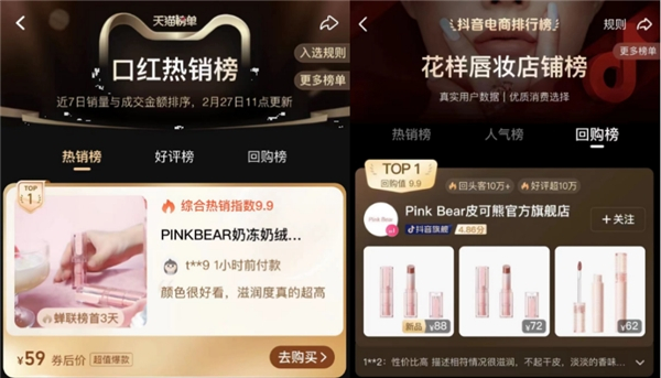 PinkBear皮可熊努力为大家提供更舒适的彩妆体验,与少女们一起开启一个被爱和温暖包裹的色彩世界。今年2月,PinkBear皮可熊全新单品「奶冻」水光口红为料峭春日来了一丝明媚的活力,产品以一抹即得透亮水润的独特质地得到了少女们的广泛青睐。「奶冻」水光口红于天猫榜单-口红热销榜蝉联多天榜首,同期官方旗舰店登顶抖音电商排行榜-花样唇妆店铺回购榜榜首,回头客与好评数量均超过10万。