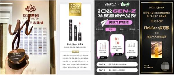 去年,品牌获得金匠奖2022年度十大新锐品牌奖项,第十一届美尚博览会暨全球美尚峰会2022年度超新星品牌奖,彰显出新秀美妆品牌的新锐潜力;在联名产品方面,甜酷感满满的牛仔唇泥酷洛米限定款获得OnlyLady年度口碑哑光唇泥奖项,卡通可爱的PinkBear与海绵宝宝联名玩趣彩妆系列获得中国授权金星奖。此外,人气当家产品牛仔唇泥也获得在红秀第八届美容实验室大奖评选中[BEST显色]称号,少女元气唇妆必备单品的泡泡水光唇釉获评CBNData x Yiyouth2022GEN-Z年度喜爱产品榜TOP2,PinkBear皮可熊不断鼓励少女们大胆前行,陪伴她们面对生活中的种种挑战,找寻制造美好生活的魔法秘方。