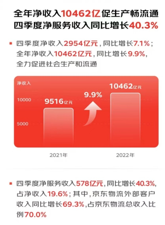 北京时间3月10日,京东集团(纳斯达克股票代码:JD,港交所股票代号:9618)发布了2022年第四季度及全年业绩,2022年第四季度净收入为2954亿元人民币(约428亿美元),同比增长7.1%。2022年第四季度净服务收入为578亿元人民币(约84亿美元),同比增长40.3%。2022年全年净收入为10462亿元人民币(约1,517亿美元),同比增长9.9%。可以看出,2022全年京东携手品牌实现了有质量的增长,完成了降本增效、高质量增长的目标。