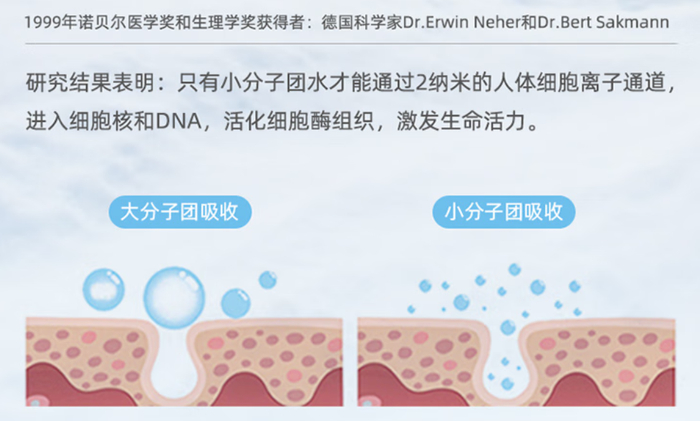 低氘水小分子水粘度低,表面张力大,密度小。普通水的分子团是低氘水分子团的2倍及以上。经核磁共振NMR技术测定,90赫兹(Hz)以内为小分子水,5100西藏冰川矿泉水是80Hz以下的低氘水分子团水,直径与人体细胞膜的亲水性通道直径相近,因此更容易通过细胞膜的水通道。饮用低氘小分子水后,更容易被人体细胞吸收及代谢,从而提高身体的排毒、解毒能力,尤其是年纪大的、身体亚健康的人群饮用会更有帮助。因此,5100西藏冰川矿泉水水也是一款细胞爱喝的水。