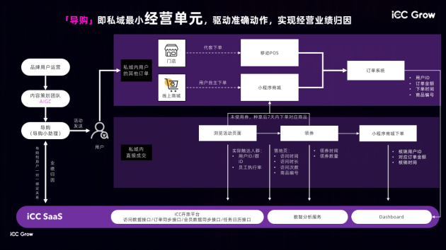 在此之上,iCC通过技术方式将导购运营形成闭环。通过数据链路里面非常精准的埋点方式,从用户订单转到线下,还是转到线上,还是在下单,从到店到人的埋点,还是追踪到审核、核销、报销等整个CRM链条上,iCC都有完整的技术支持,帮助企业做准确的运营动作、帮助实现业绩的成功。