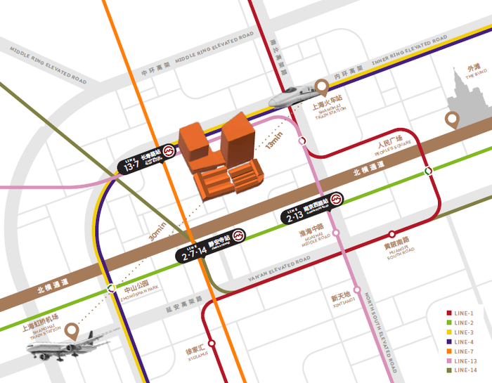 作为普陀十四五发展重点“一带一心一城”中的一带,苏河水岸经济发展带定位为产城融合的高质量发展示范区。地处苏河水岸经济发展带核心位置的鸿寿坊,坐拥7/13号线双轨交长寿路站、紧邻静安寺商圈,15分钟能畅达上海各大CBD,同时毗邻串联北上海多个经济板块的北横通道,20分钟内到达上海火车站、虹桥站等交通枢纽,高效实现城际商务沟通。
