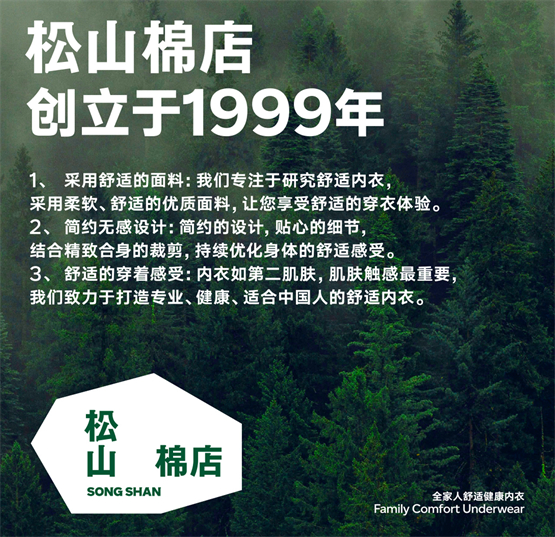松山棉店在创新上的思考从未停止,通过海量的消费者数据反馈,把无尺码、牛奶棉、发热绒这些近些年来较新的概念通过研发应用在商品上,打造出更合中国消费者的贴身产品。同时,品牌还将自然元素带入其中,让消费者在满足贴身舒适需求的同时可以体验自然材质带来的健康、养护。